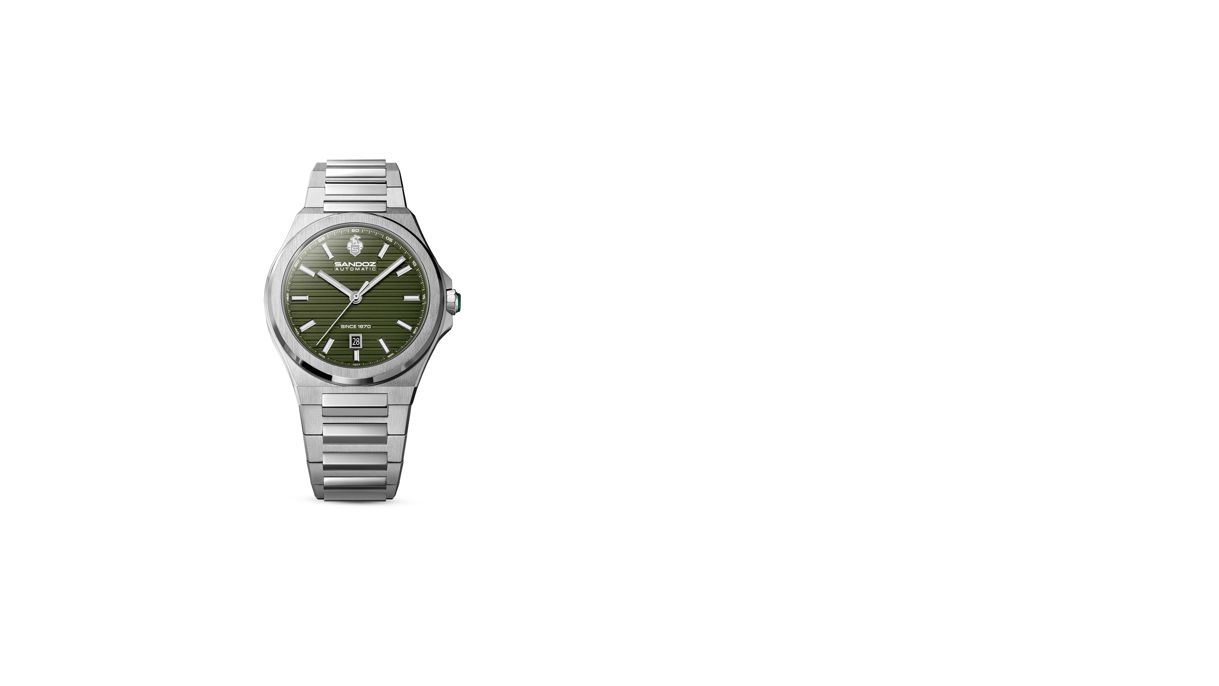 The 42mm case has a bold, modern presence, all clean lines and considered proportions, topped with a flat sapphire crystal that gives it a crisp, architectural feel. The olive dial is quietly assertive, patterned for depth. Luminous silver hands and indexes cut through, offering clarity. Inside, the automatic movement keeps steady time, powering a classic three-hand layout with a date window. On the wrist, the sturdy bracelet adds a refined contrast to the overall design.