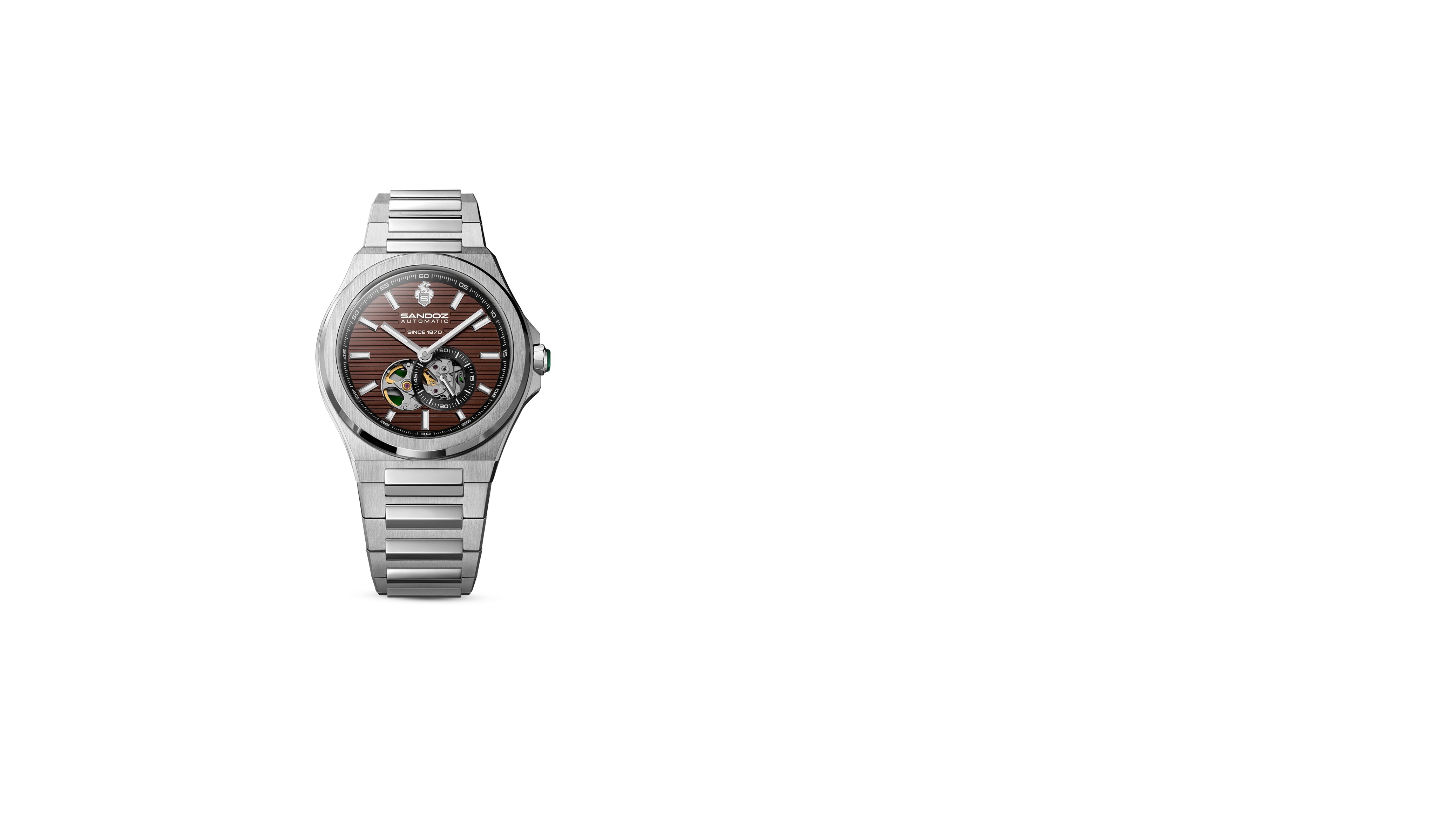 The 42mm case has a strong, modern profile, with clean surfaces and just the right amount of masculinity. Up top, a flat sapphire crystal keeps things sharp. The brown dial - patterned for depth, symmetrical by design, and framed by luminous silver hands and markers stay legible. At six o’clock, a neatly placed open-heart aperture offers a window into the automatic movement inside. The stylish bracelet grounds the piece in comfort and versatility.