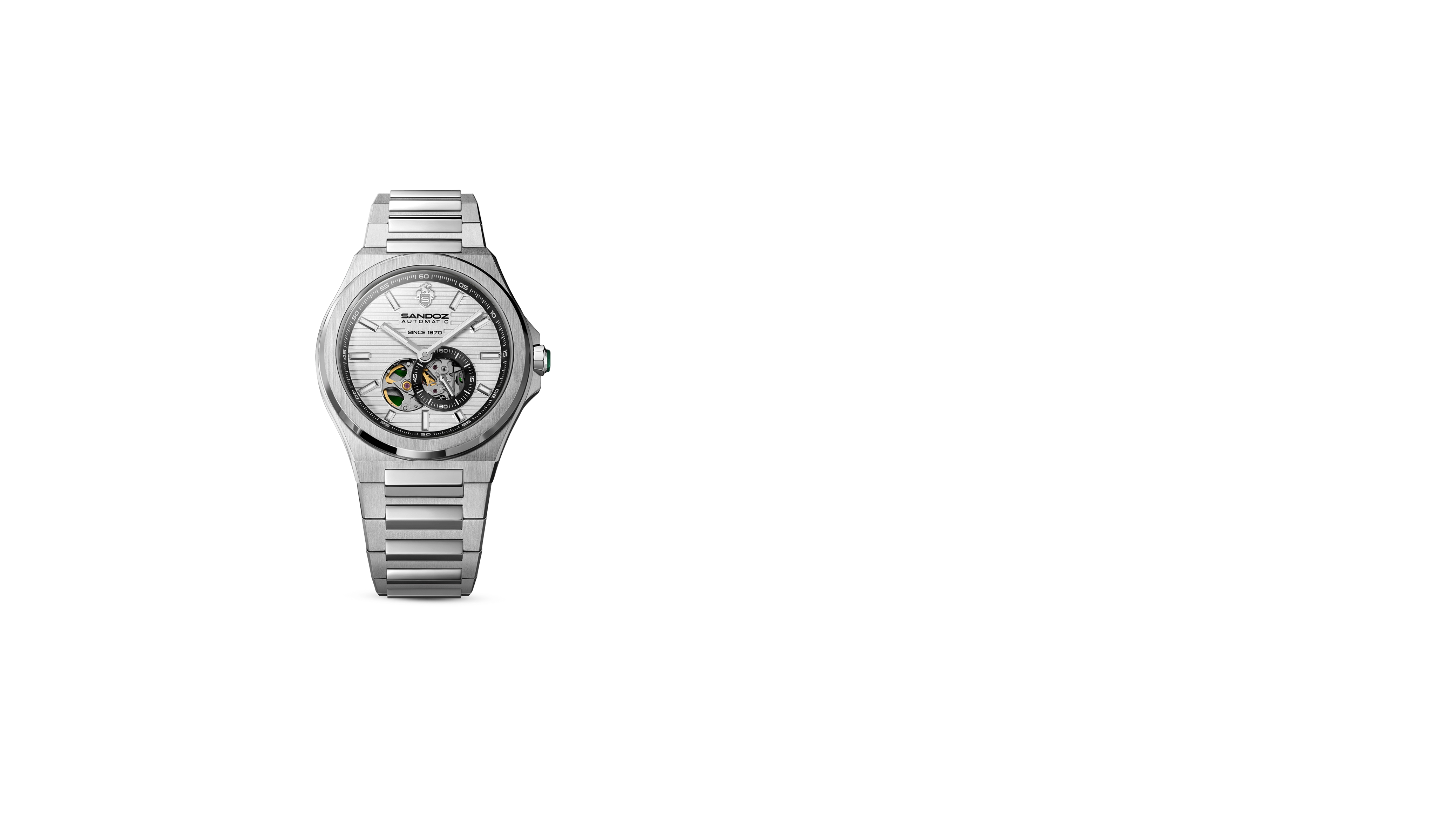 The 42mm case has a strong, modern profile, with clean surfaces and just the right amount of masculinity. Up top, a flat sapphire crystal keeps things sharp. The silver dial - patterned for depth, symmetrical by design, and framed by luminous silver hands and markers stay legible. At six o’clock, a neatly placed open-heart aperture offers a window into the automatic movement inside. The stylish bracelet grounds the piece in comfort and versatility.