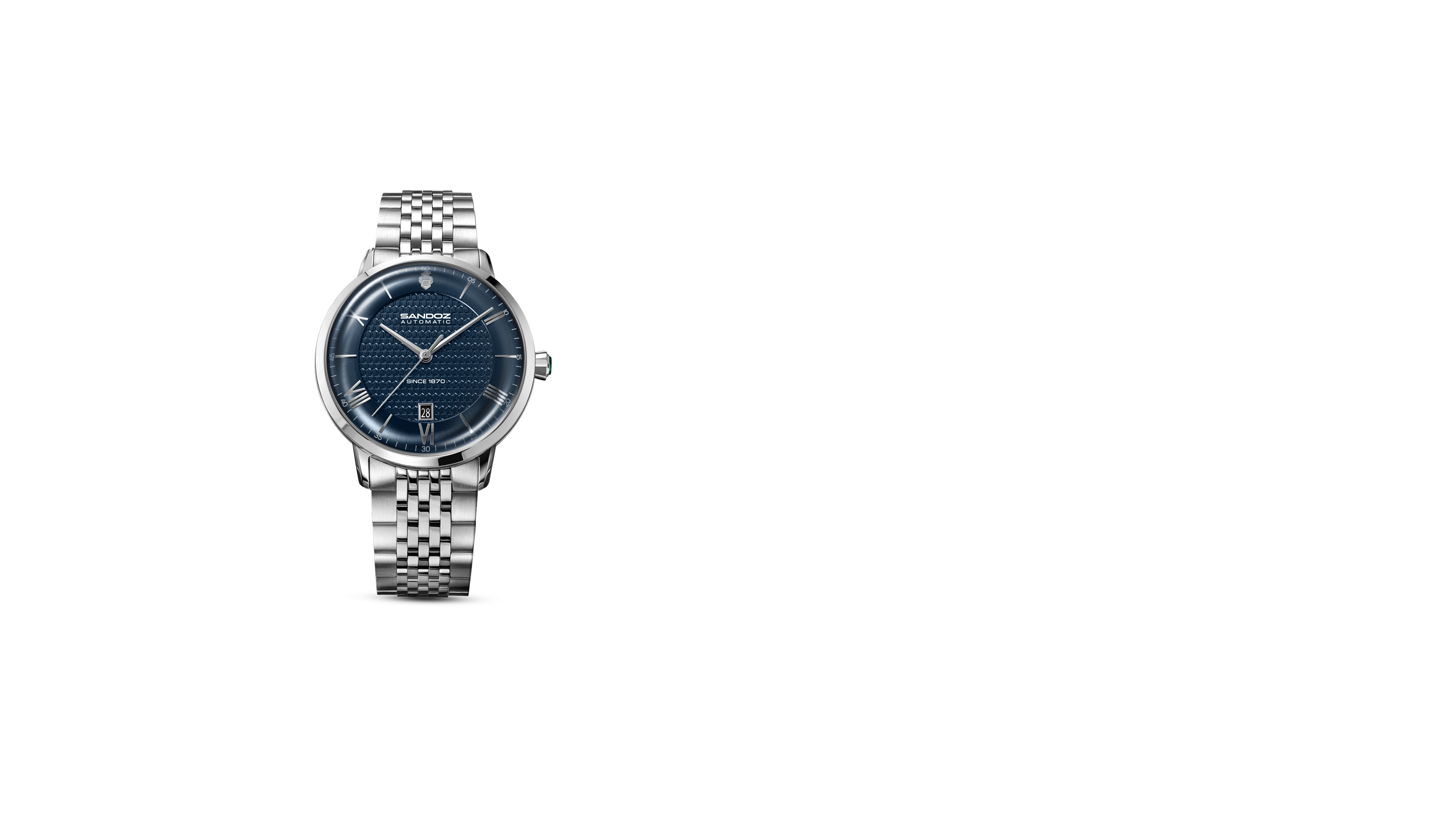 The 41mm case wears clean and confident, with a dome sapphire crystal. Underneath, the blue dial keeps things refined. A closer look will reveal the inner dial textured with a repeating pattern pulled from the Sandoz crest - a subtle nod to heritage. The silver indexes and hands brings balance to the composition, while the Roman numerals give it just enough formality to keep it classic. Every glance reveals careful intention from the sweep of the automatic 3-hand movement with date, to the solid bracelet that completes the composition with quiet strength.