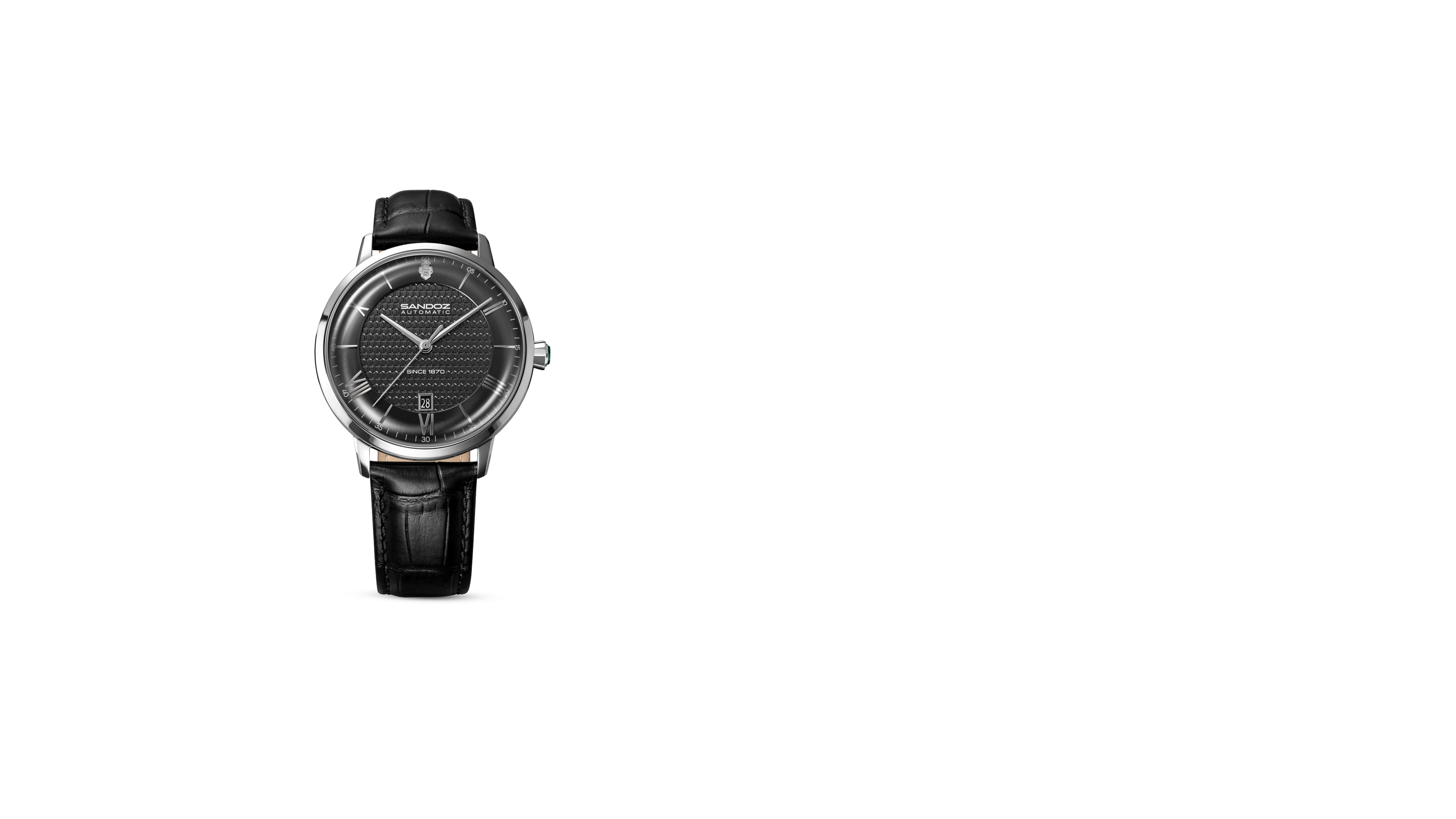 The 41mm case wears clean and confident, with a dome sapphire crystal. Underneath, the black dial keeps things refined. A closer look will reveal the inner dial textured with a repeating pattern pulled from the Sandoz crest - a subtle nod to heritage. The silver indexes and hands brings balance to the composition, while the Roman numerals give it just enough formality to keep it classic. Every glance reveals careful intention from the sweep of the automatic 3-hand movement with date, to the subtle taper of the black leather strap.