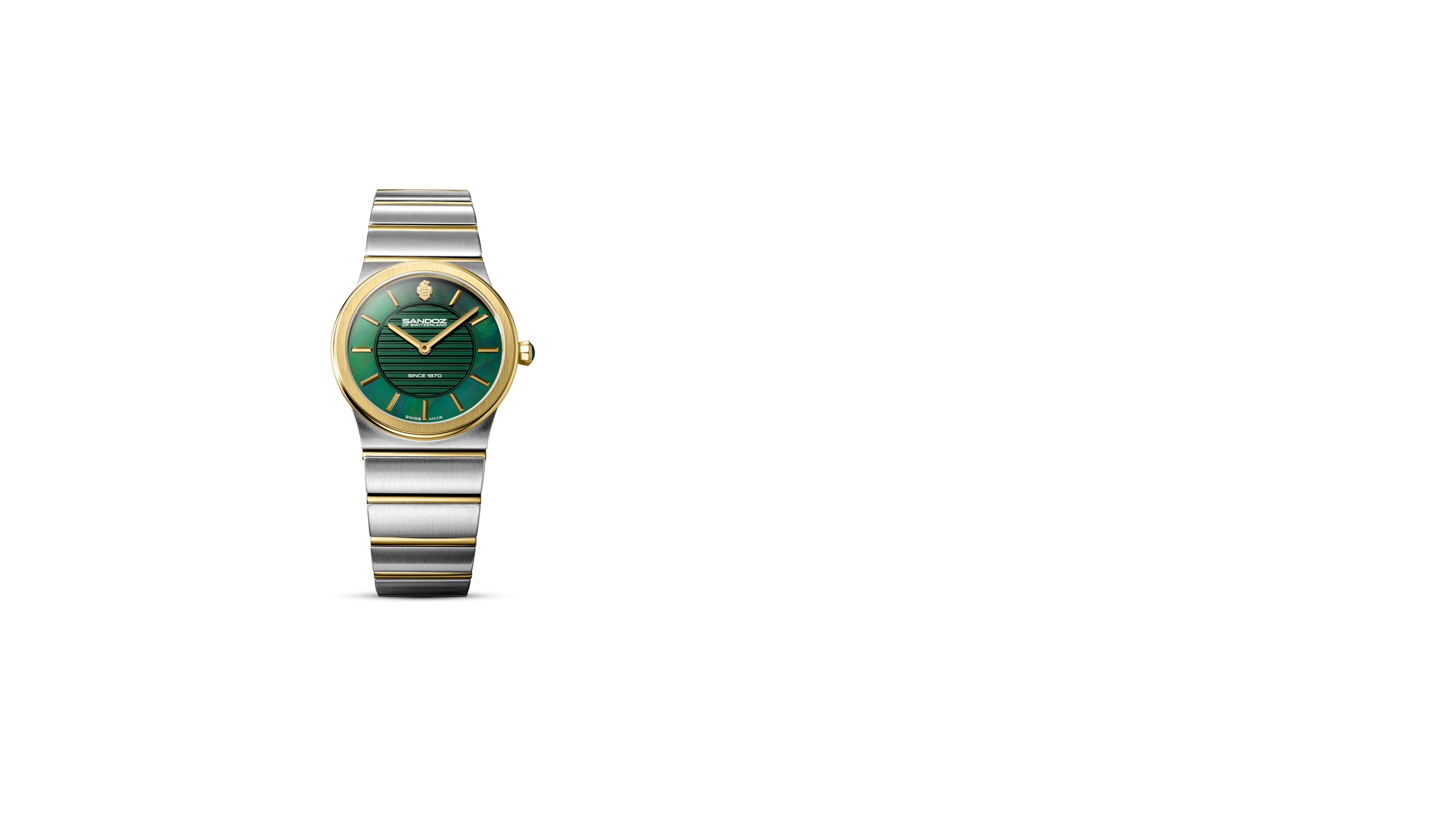 Its deep layered green dial plays with contrast: the outer ring is crafted from smooth and understated mother of pearl, while the inner circle reveals a subtle line pattern. The sleek yellow gold hour markers and hands add to the dial's quiet depth. The cool design is offset by the warmth of polished accents and a domed cabochon crown. This is a watch that's modern in its sensibility, timeless in its presence.