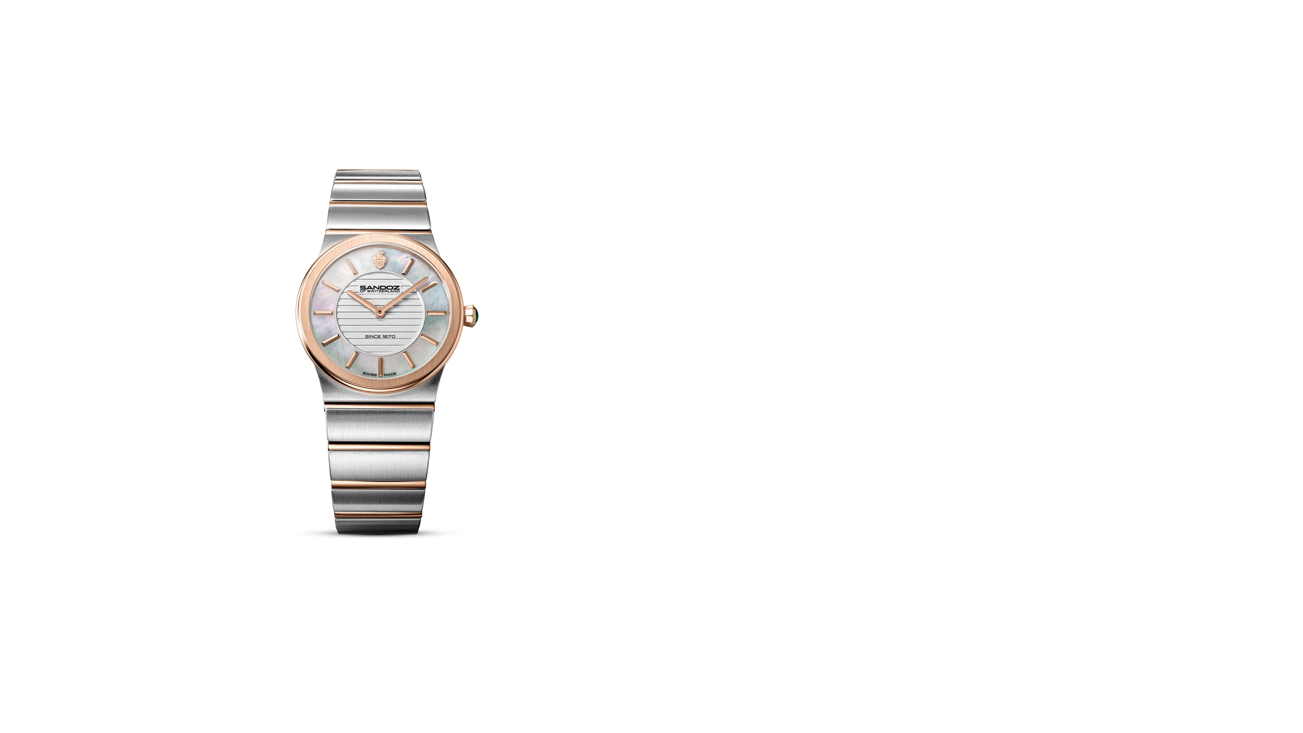 Its pristine layered white dial plays with contrast: the outer ring is crafted from smooth and understated mother of pearl, while the inner circle reveals a subtle line pattern. The sleek rose gold hour markers and hands add to the dial's quiet depth. The cool design is offset by the warmth of polished accents and a domed cabochon crown. This is a watch that's modern in its sensibility, timeless in its presence.